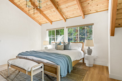 Nestled among the trees and with peek-a-boo views of Lake Arrowhead, West Shore is a cozy cabin with room for the whole family. After a day on the water, park your boat on your private dock and retire to the main-floor primary suite. With a wood beamed ceiling and luxury en suite bathroom, it’s a peaceful retreat in the heart of the home.